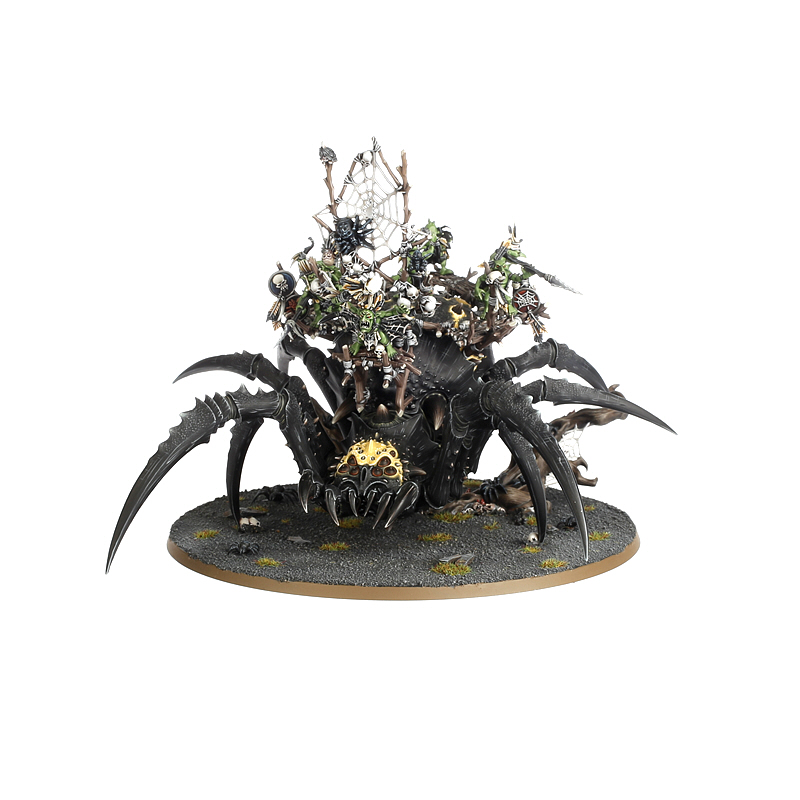 Arachnarok Spiders are vast arachnid predators possessed of a malevolent sentience. These monstrous creatures stalk into battle carrying rickety howdahs full of shrieking Spiderfang grots, who worship the creatures as the progeny of their eight-legged deity.