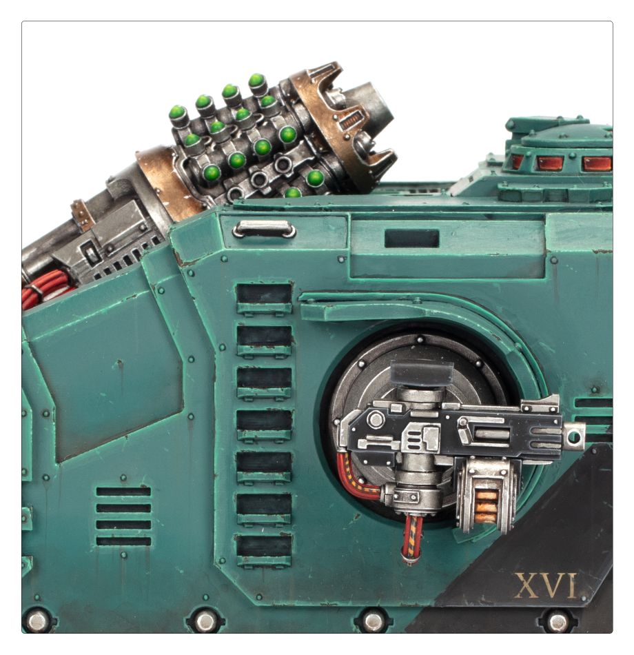 The Legion Arquitor is a heavy artillery platform designed to operate at the forefront of a Legiones Astartes advance. Equipped with a reinforced chassis and brutal short range firepower, it is called upon to break the most stubborn of fortifications or to annihilate massed enemy infantry and armour. The graviton-charge cannon fires energised canisters that impact among the enemy ranks, emitting a graviton field that crushes delicate circuitry and electronics, disrupting the advance of anything that survives the barrage.
