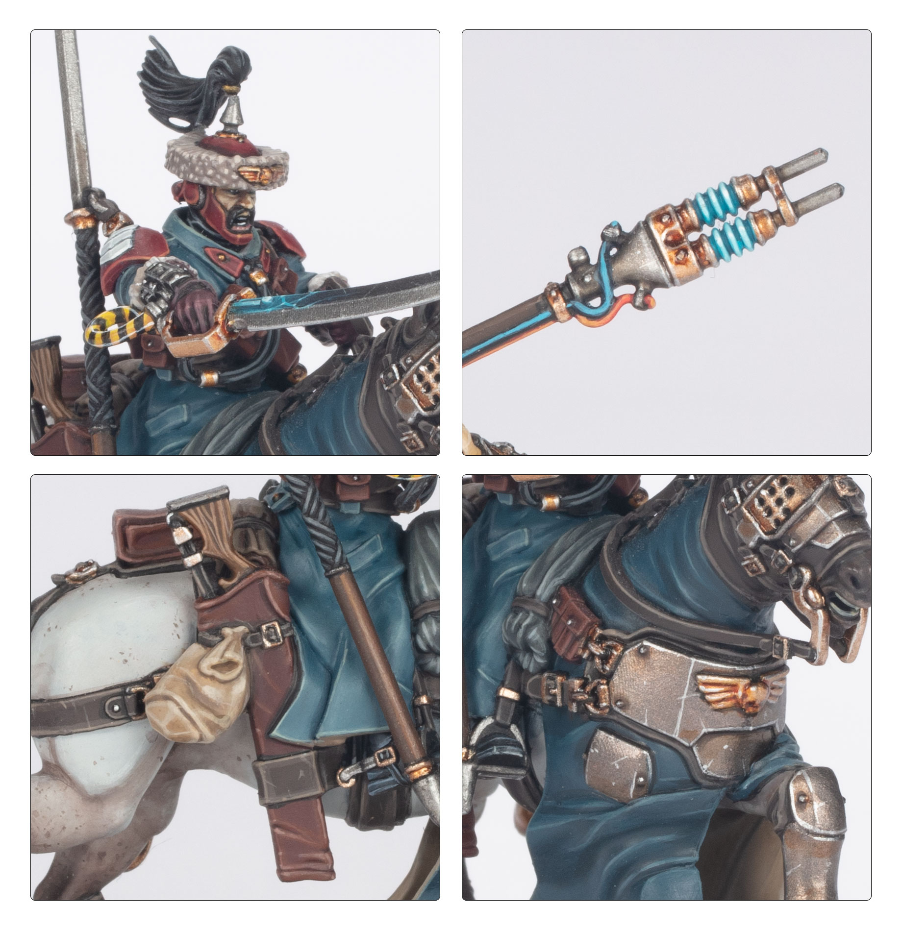 Rough Riders are potent cavalry troops fielded by the Astra Militarum – the most famous of which are recruited from the steppes of Attila. Their combat skill and sheer mobility makes these horsemasters a powerful force, whether spearheading an attack or outflanking the foe. When the moment comes to launch a charge, the Rough Riders plunge their hunting lances into the foe and detonate the deadly tips, lending an explosive impact to the assault.