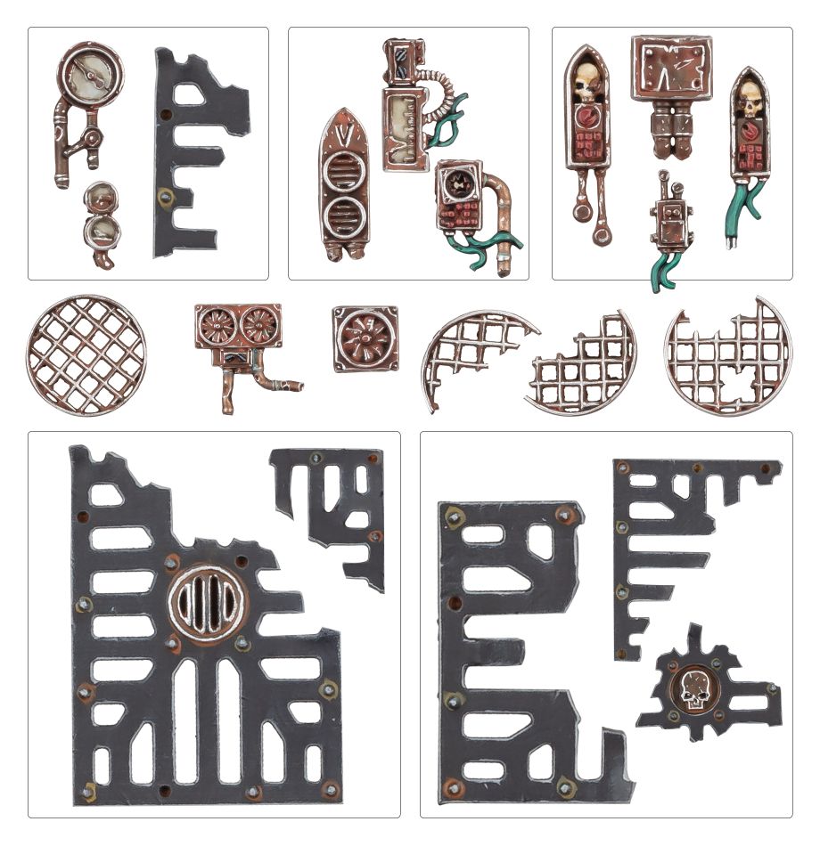 In addition to the bases, this kit contains loads pieces of grim and industrial basing material to add detail and narrative elements to your miniatures, such as gantry sections, broken grille panels, discarded fans,