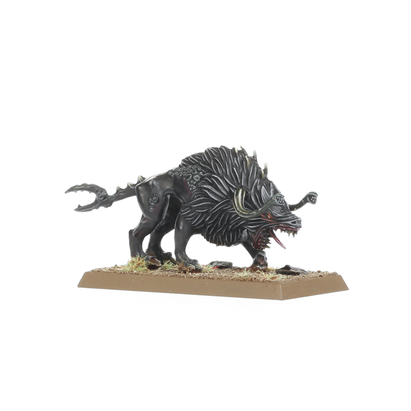 Chaos Warhounds are tireless hunters built of little more than muscle and fang, made all the more horrifying by the warping effect of Chaos, causing them to sprout horns, tusks and spines. They prowl the wilderness in ravening packs, running down prey that ranges in size from stray children to young ice mammoths.