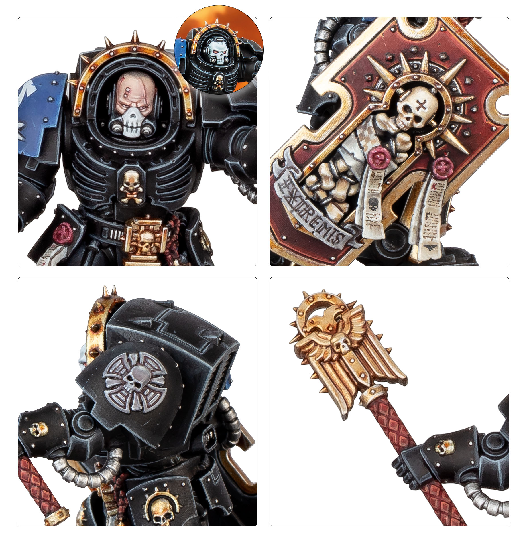 Chaplains rouse Space Marines to war with their litanies of faith, and never is this spiritual fortification more vital than amidst the blood and horror of boarding actions and beachhead strikes. Thus, Chaplains are trained to wear formidable Terminator armour so they can fight alongside veteran battle-brothers in the heaviest combat.