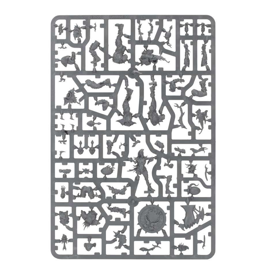 This multi-part plastic kit contains the components necessary to assemble the Naggaroth Nightmares, a Dark Elf Blood Bowl team. The team consists of 6 Linemen, 2 Blitzers, 2 Runners and 2 Witch Elves –