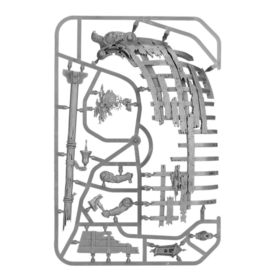 This multi-part plastic kit contains the components necessary to assemble a Gloomtide Shipwreck. This is an Etheric Vortex scenery piece, which models with the Idoneth Deepkin allegiance have access to. The