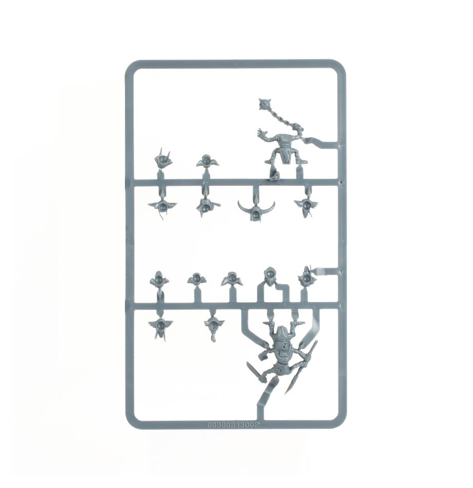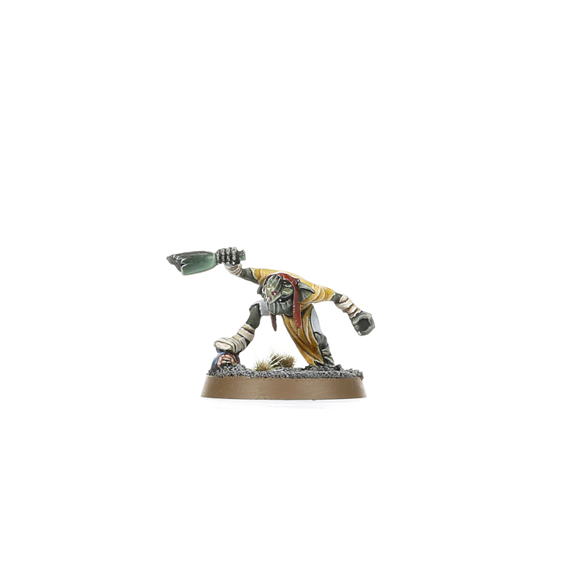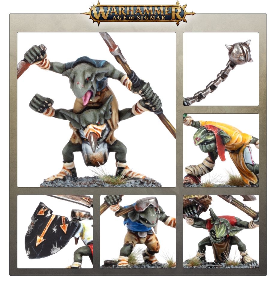 Gnoblars are small, weedy, and green, with outsized noses, wide ears, and an overdeveloped sense of spite. On their own merit, they are unlikely to survive for long, but by entering into a loose symbiotic relationship with an ogor, at least they have a fearsome creature to hide behind. There’s nothing a Gnoblar likes more than a bit of looting, as all too often, ogors will pass over something of genuine worth in their haste to eat the flesh of the fallen.
