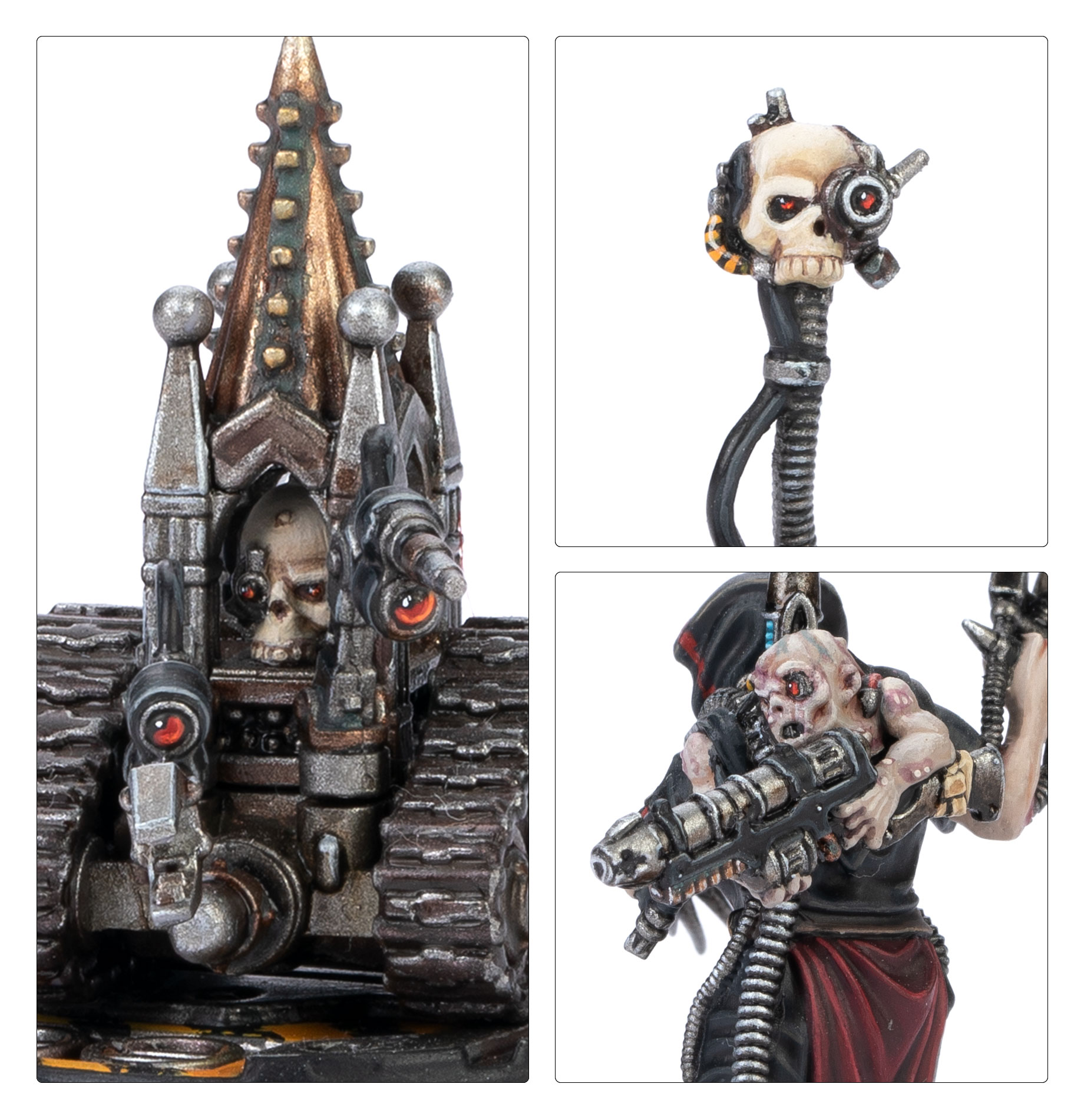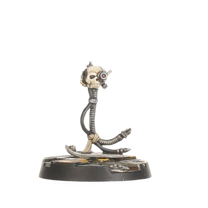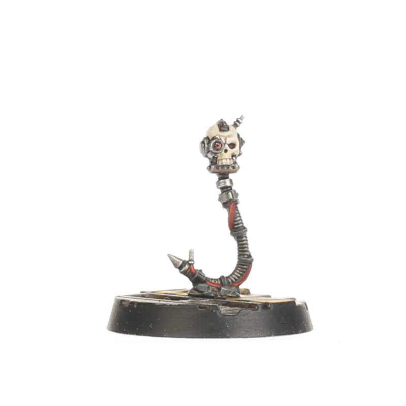 This multipart resin kit builds one Heretek, a trafficker in forbidden technology, as well as a pair of floating servo-skulls and a tracked servo-skull. The Heretek can be taken as a Hanger-on in Outlaw gangs in games of Necromunda. If you need some very illegal upgrades on your