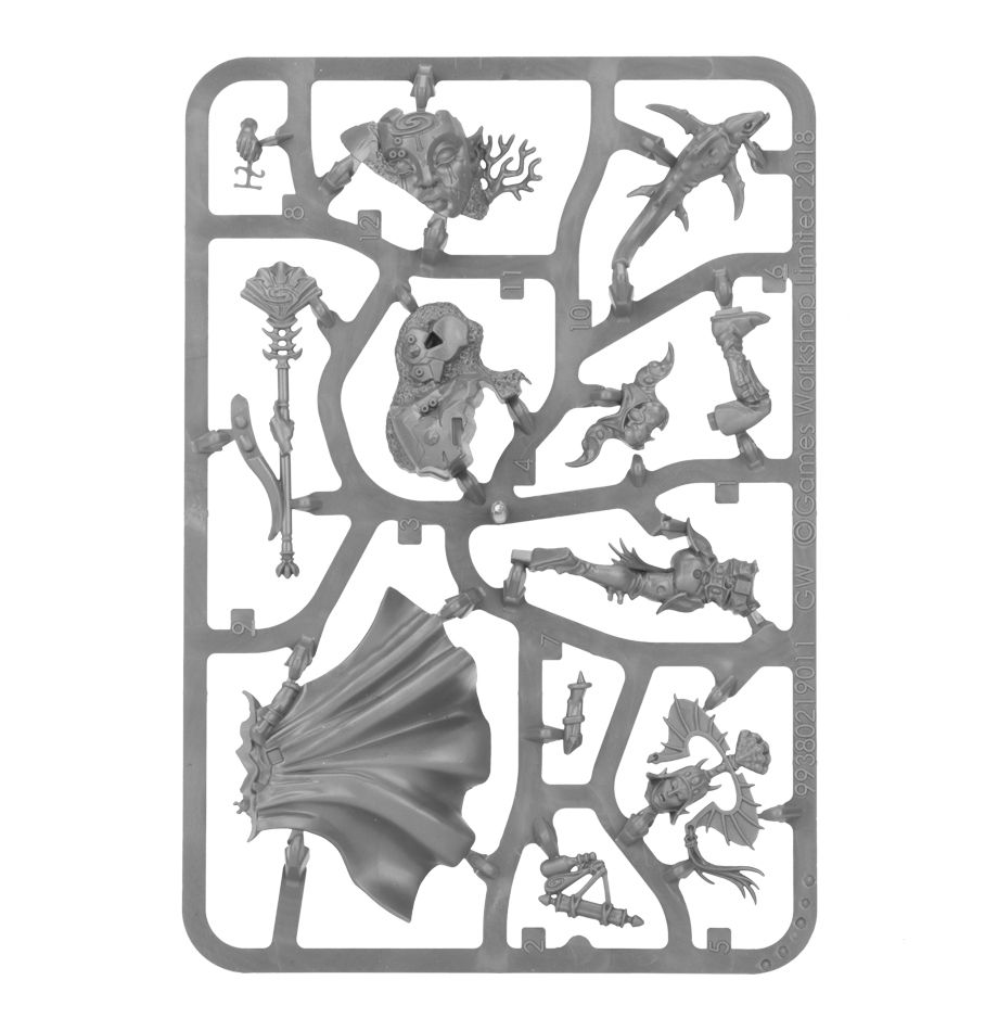 It is the Tidecasters who conjure the phantasmal sea that allows aelf and aquatic beast to move and breathe as if they were in their own natural environment. They are able to conjure spells from the repressed anguish of the Idoneth, the curse that echoes still from their ancestors’ torture within Slaanesh. Such magics take the form of crushing waves of despair, black pits of hopelessness or raging maelstroms of horror that shatter the minds of the foe, leaving them open to attacks from the Namarti and Akhelians. So potent are these enchantments that some victims believe themselves to be