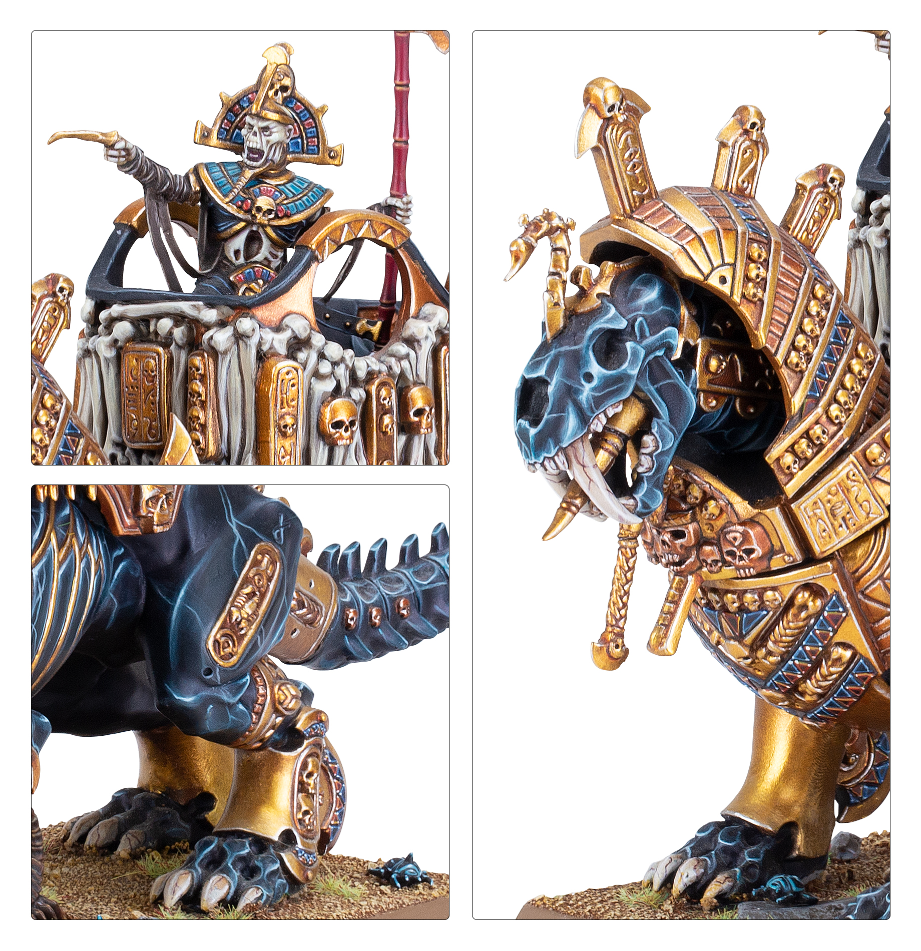 Khemrian Warsphinxes are giant leonine statues created to roam the chambers of royal pyramids, guarding the inner sanctums of great Tomb Kings. In battle, they wade through the ranks of their foes, blows glancing off their stone hides as they crush the living underfoot like bothersome insects. Tomb Guard elites stand atop the Warsphinx’s back in an ornate howdah, laying into the enemies below with great, double-handed spears and safeguarding the royalty who sometimes elect to ride alongside them.