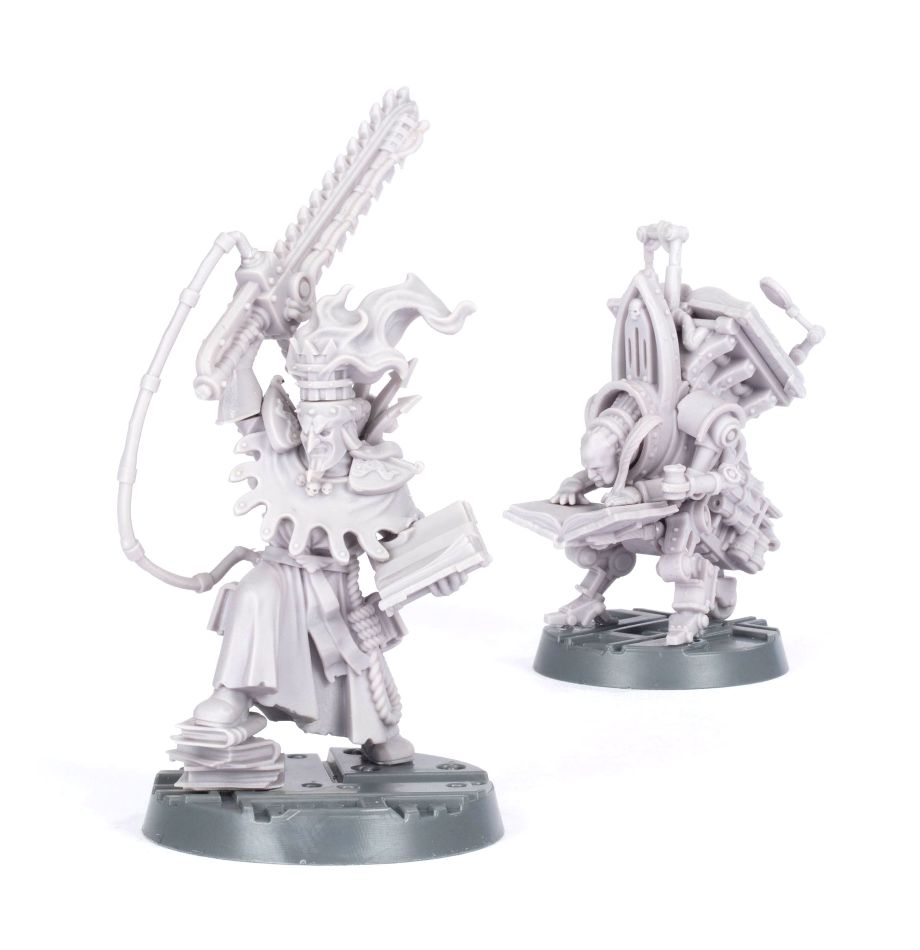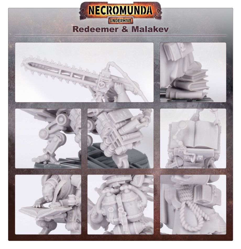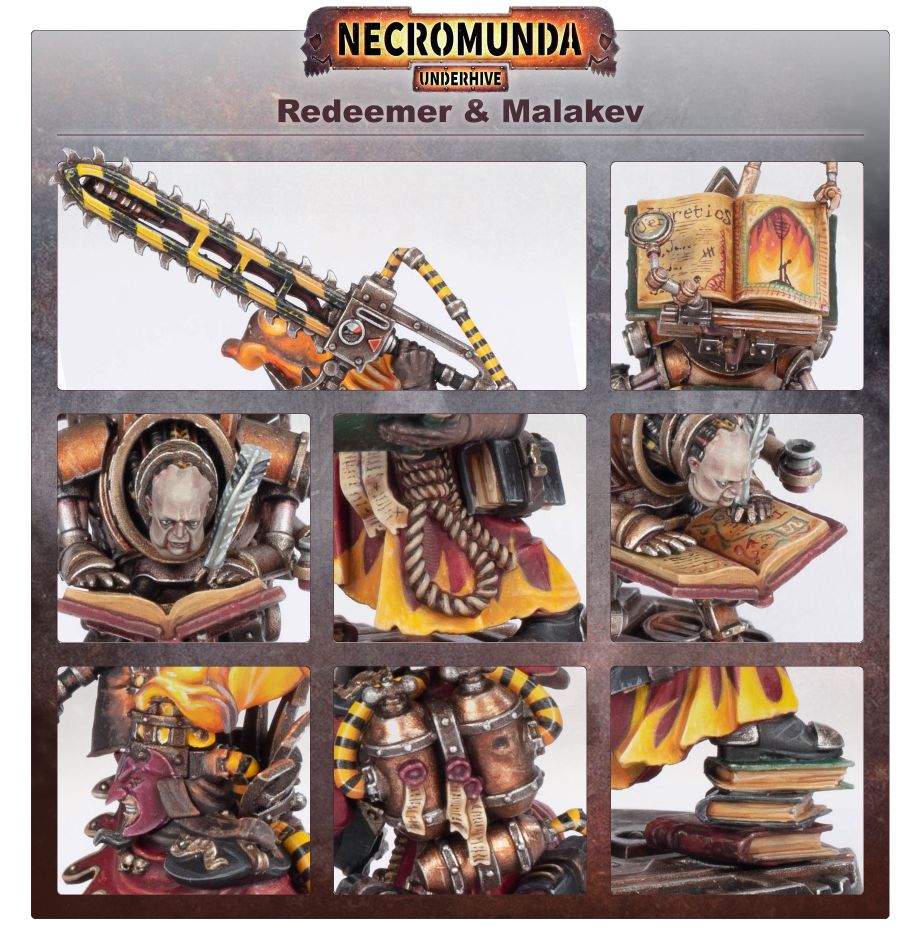 Klovis the Redeemer and Deacon Malakev are rarely seen apart. In order to impart the Emperor’s faith to the wretched and unloved in the underhive of Necromunda, they work as a well-oiled team. Klovis himself brings the fire and fury of faith, flames emblazoned on his robes, brazier lit and spitting, eviscerator chainsaw rattling, giving his sermons an even more violent undertone. Deacon Malakev is Klovis’ dedicated servant, and he is barely more than a mobile lectern. He dutifully follows Klovis around the underhive, recording his deeds within books and on parchment, his hunched form