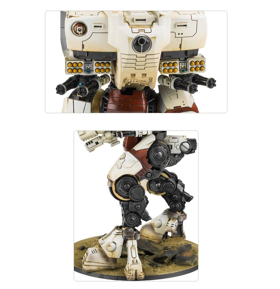 T’au Supremacy armour is larger than any other current class of battlesuit. It is intended for a task that the T’au Empire has not yet had to face – the defence of worlds within their growing domain from the counter-expansion forces of other races. Lacking the manoeuvrability of other battlesuits, the KX139 Ta’unar Supremacy Armour was designed for static defence, carrying massively destructive, long range weapons.