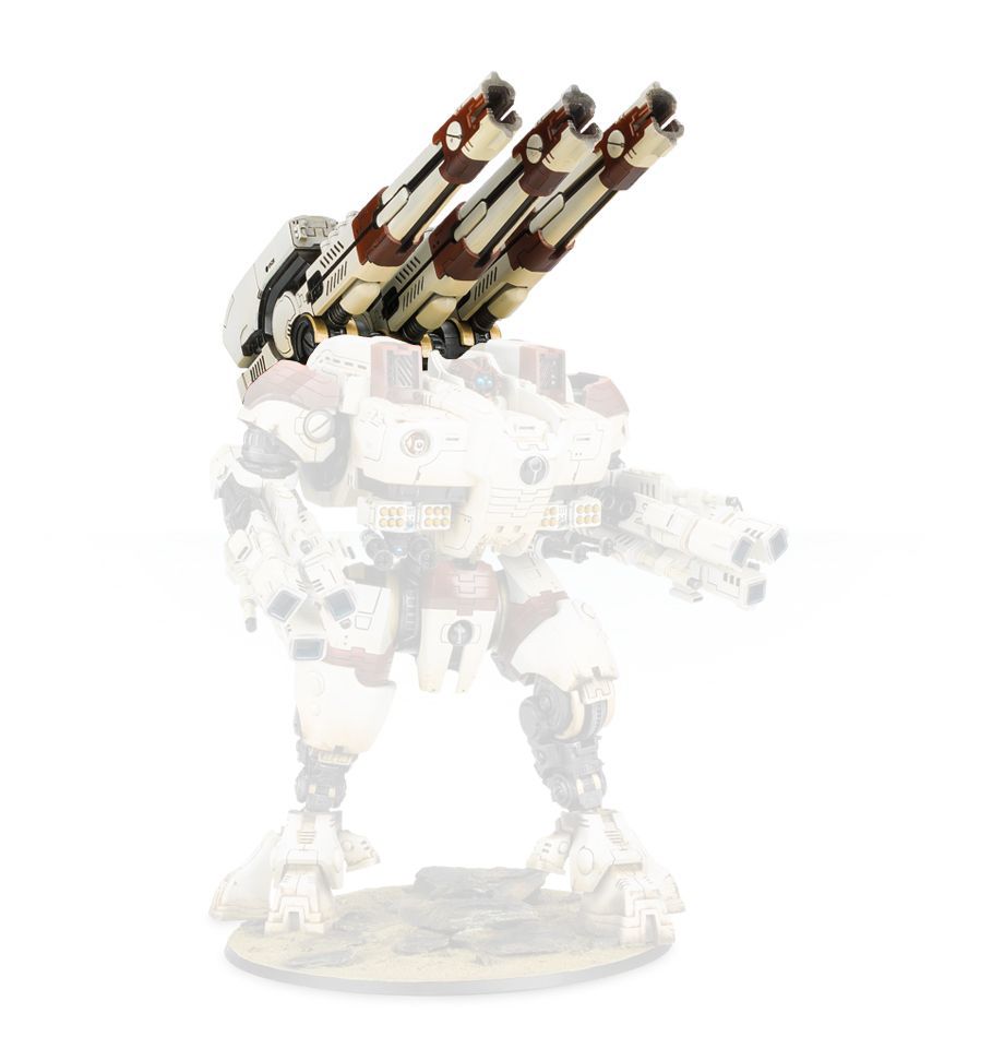 A recent development of T’au pulse technology, this triple-barrelled Pulse Ordnance Multi-driver uses powerful induction fields to propel a variety of heavy munitions with great force and precision. Fired in rapid volleys, this mix of high explosive and kinetic projectiles can be used to either saturate a single target with concentrated bombardments, or shower a wider area with arcing trajectories to equally devastating effect