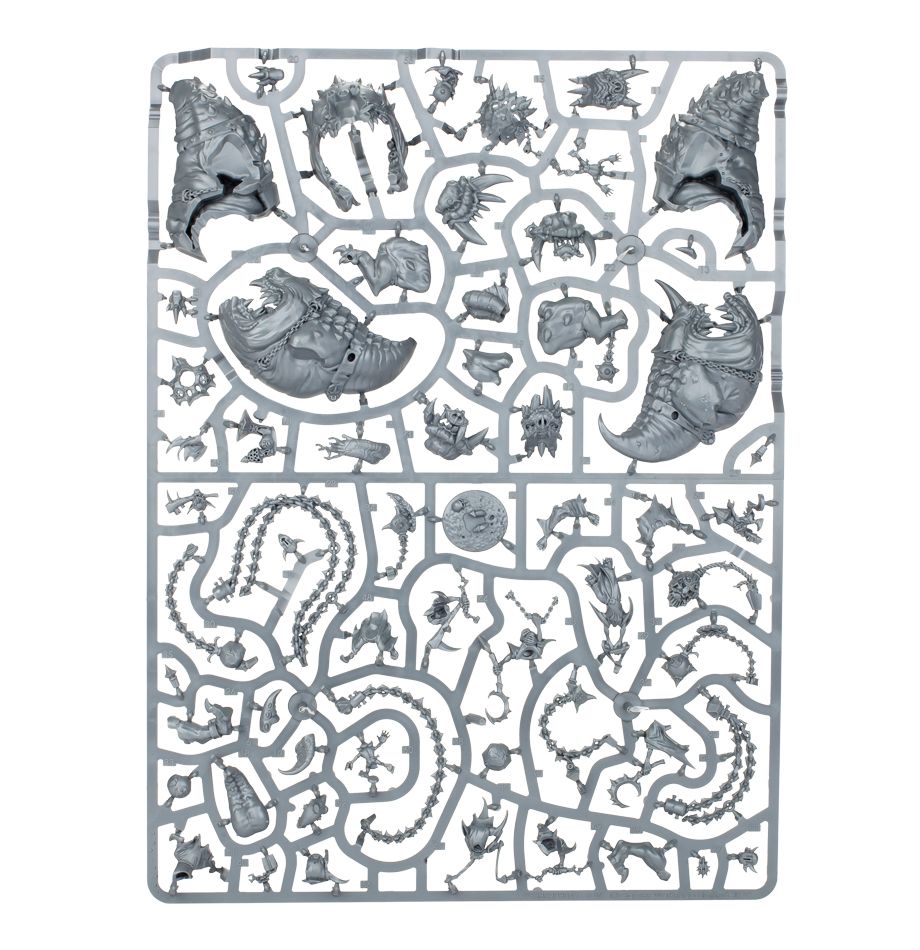 This multipart plastic kit builds one set of Mangler Squigs – a conjoined flail of fanged death. These massive monsters are a dynamic collection of drooling jaws and tangled ball-and-chains, with grot riders clinging on for dear life. This kit is packed with
