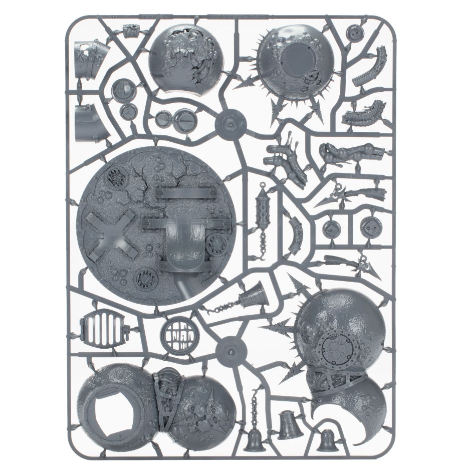 Miasmic Malignifiers – festooned with swaying plague censers and tainted bells – belch thick fumes from their rusted chimneys. Sown like spores across worlds, they are parasites that suck filth from the ground and latch themselves onto local infrastructure, polluting a planet on every level.