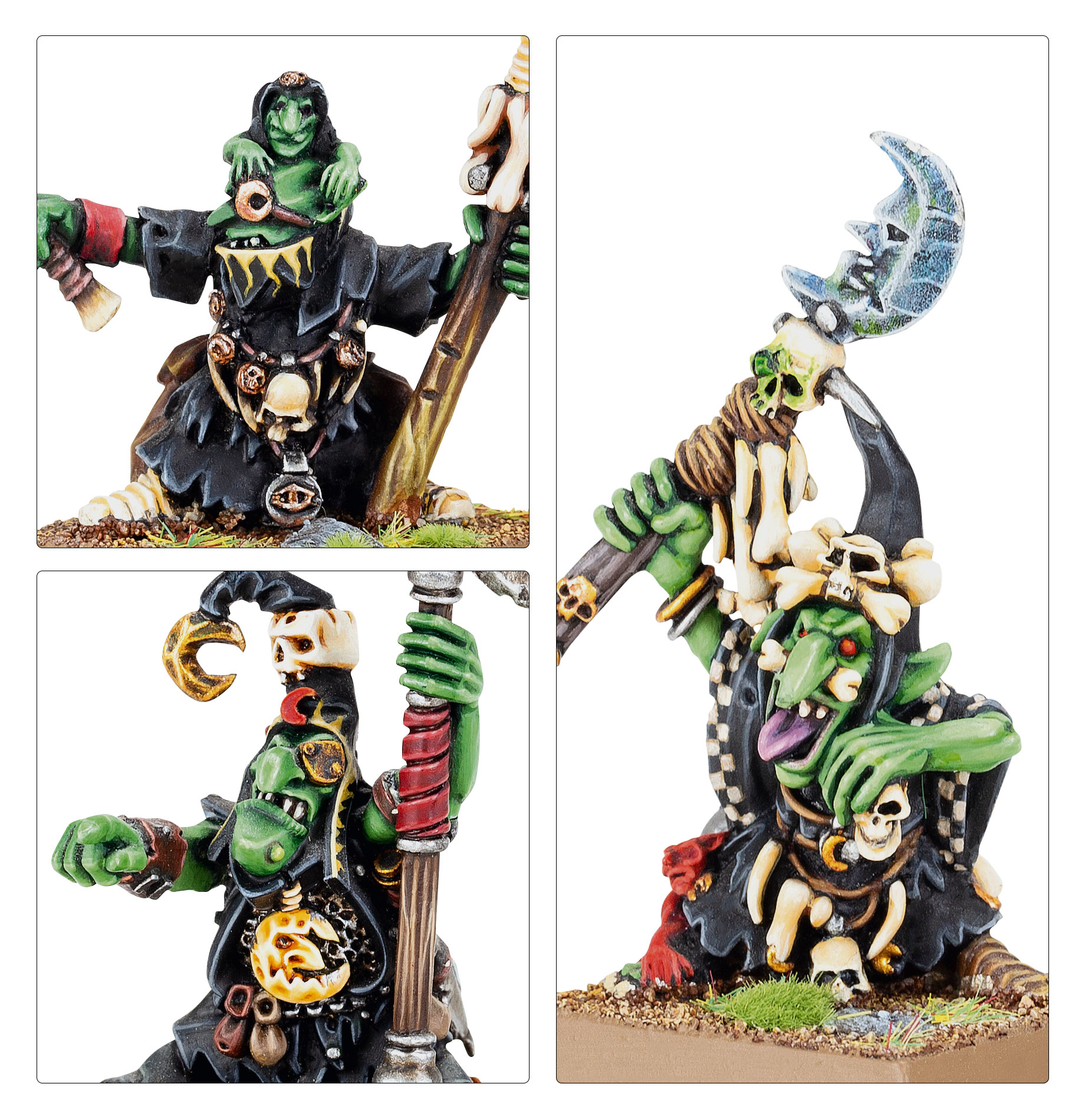 This multipart metal kit builds 3 Night Goblin Shamans – cunning and cruel magic-wielders for Orc & Goblin Tribes in games of Warhammer: The Old World. These shamans are shown armed with their individual shaman staffs and wearing Night Goblin cloaks featuring the crooked moon icon.