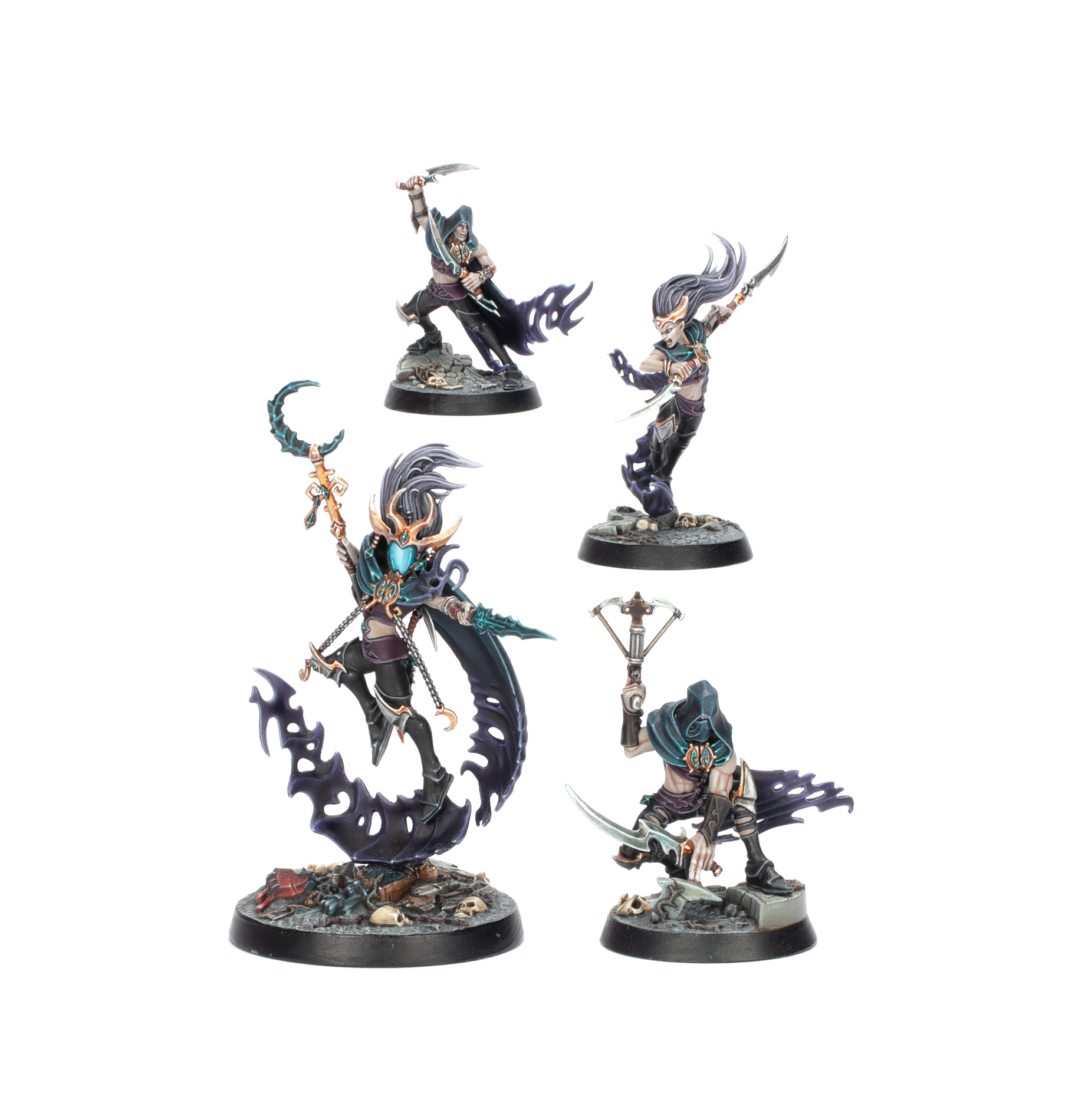 This kit collects four Order-themed warbands for Warhammer Underworlds. All the miniatures are push-fit, moulded in coloured plastic, and include scenic bases on the frames so you can start playing quickly. You’ll also find warscroll cards and fighter cards for each warband. The Shadeborn are an aggressive Strike warband, Xandire’s Truthseekers are a versatile Flex warband, The