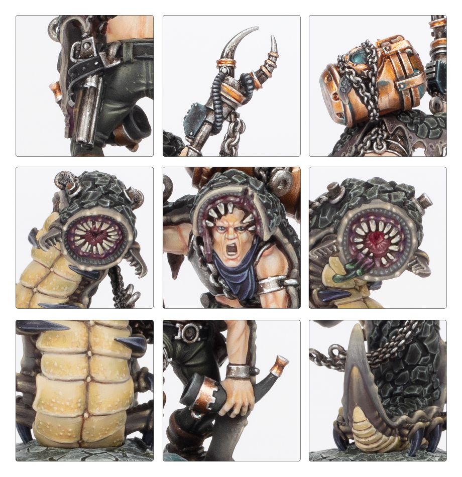 Outland Beastmasters capture and train the countless critters that infest wasteland settlements and the underhive depths. For a price, a Beastmaster will lend their talents – and their beasts – to a gang, taking foes by surprise as murderous vermin strike from the shadows. The worm-like, rock-skinned Millisaurs that infest Necromunda are especially unsettling companions – these subterranean creatures burrow through everything from radioactive sand to solid rockcrete, emerging from hidden vents and forgotten tunnels in a flurry of drool and razor-sharp teeth.
