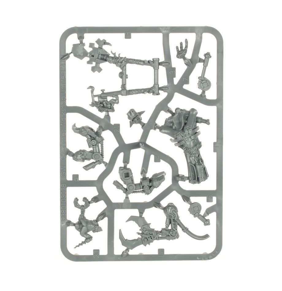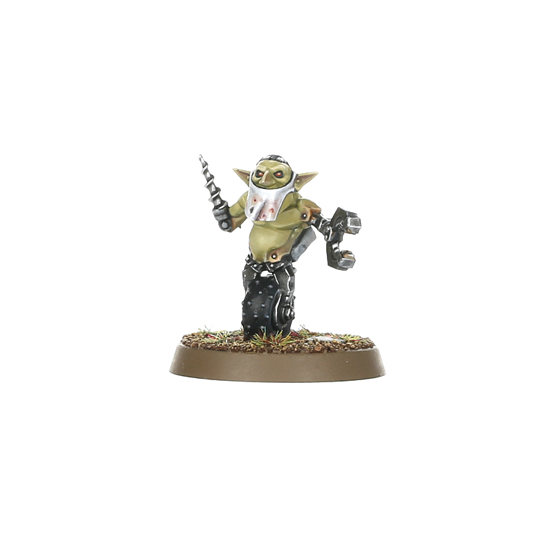 The Painbosses of the Beast Snaggas are battlefield doctors hardened by many brutal conflicts. Augmented with a whole host of cybernetics and armed with a suite of surgical tools and squig-based remedies, they are always on hand to replace a limb with something more suited for heavy-duty krumpin’, while their grot orderlies whiz around patching up minor wounds.