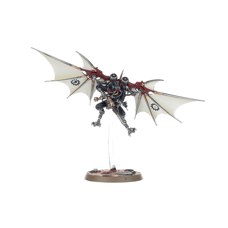 One of many specialised castes of cyborg warriors available to the Adeptus Mechanicus, the Pteraxii are optimised for instinctive reaction and agility. Pteraxii’s reflexes are accentuated by paring back elements of cogitation that impede their primary function. Implanted with additional limbstumps – scapuli superior – on their back, a flight pack of thrusters and reactive life surfaces is connected to them. The flight packs become part of the Pteraxii, who serve in several roles. Skystalkers find optimal vantage points from which to pick off their targets – whether isolated battlefield marks