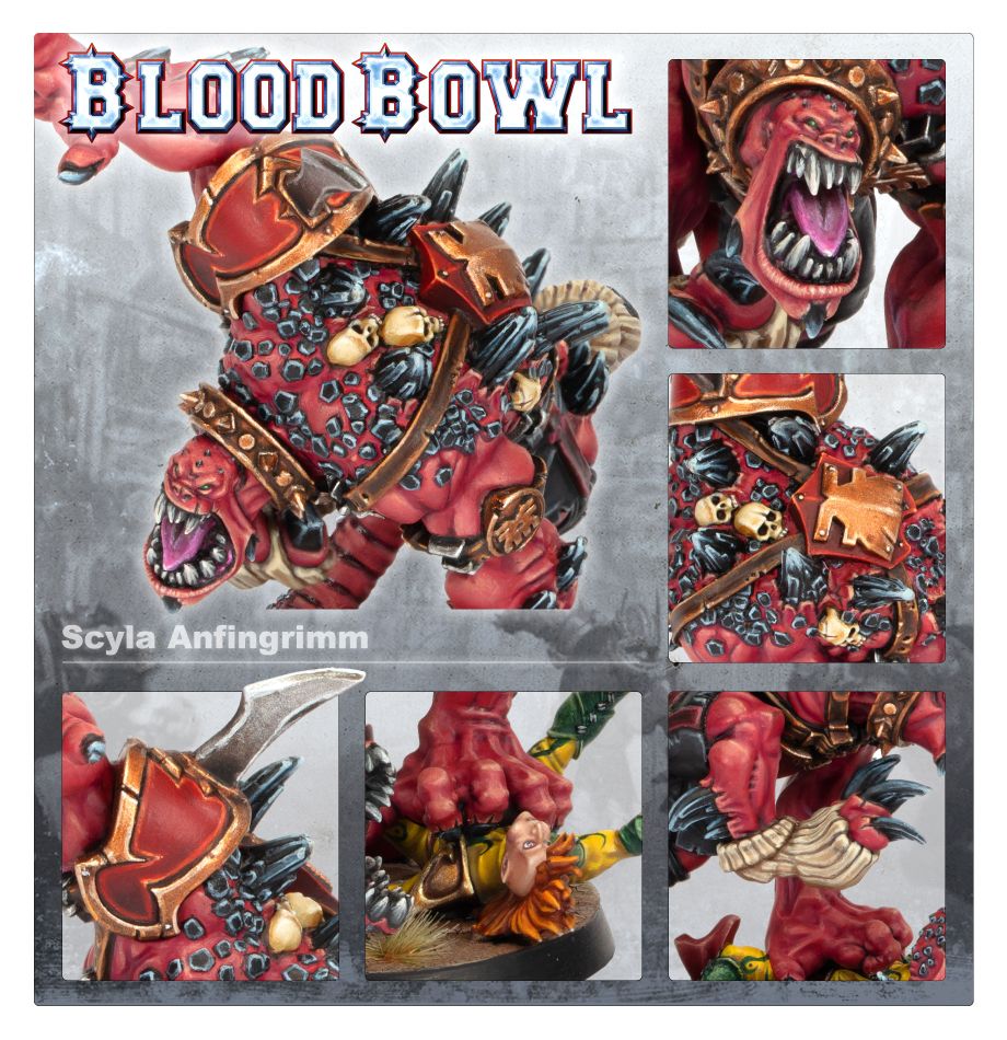 The fate of Scyla Anfingrimm is a cautionary tale to any who would accept the blessings of the Blood God too readily. Scyla bears many such gifts, from a prehensile tail ending in a tooth-lined maw to a spiked, brass collar – an iconic sign of Khorne’s favour – about his neck. Yet even though his body has devolved beyond all recognition, Scyla Anfingrimm’s power is beyond question, and the devastation he leaves in his wake on the astrogranite has made him a living legend.