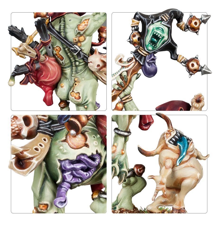 While the jokes and songs of Plaguebearers infected by the Chortling Murrain find little purchase amidst the glum Plaguebearers, Nurgle’s other daemons find the antics of the Sloppity Bilepipers hilarious. Unfortunately for their foes, this disease is incredibly infectious, and can cause mortals to laugh until their sides literally split. Despite their roles amusing the warbands of Nurgle as they march to war, the Sloppity Bilepiper is resigned to grim fate, eventually being reshaped into a set of pestilent gutpipes for the next victim of the Chortling Murrain to take up.