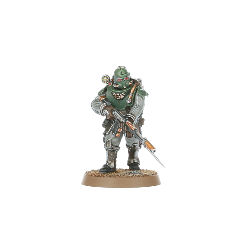 Lasrifle Sections make up the core of the Solar Auxilia, soldiers trained to wage war on battlefields across the galaxy. Clad in their signature void armour, these troopers can fight through toxic killzones, alien death worlds, and even the cold vacuum of space. Whether arrayed in disciplined ranks to stand firm against an alien horde, or launching a massed assault against enemy positions, a Lasrifle Section can unleash volley after volley of concentrated laser fire until the field is won.