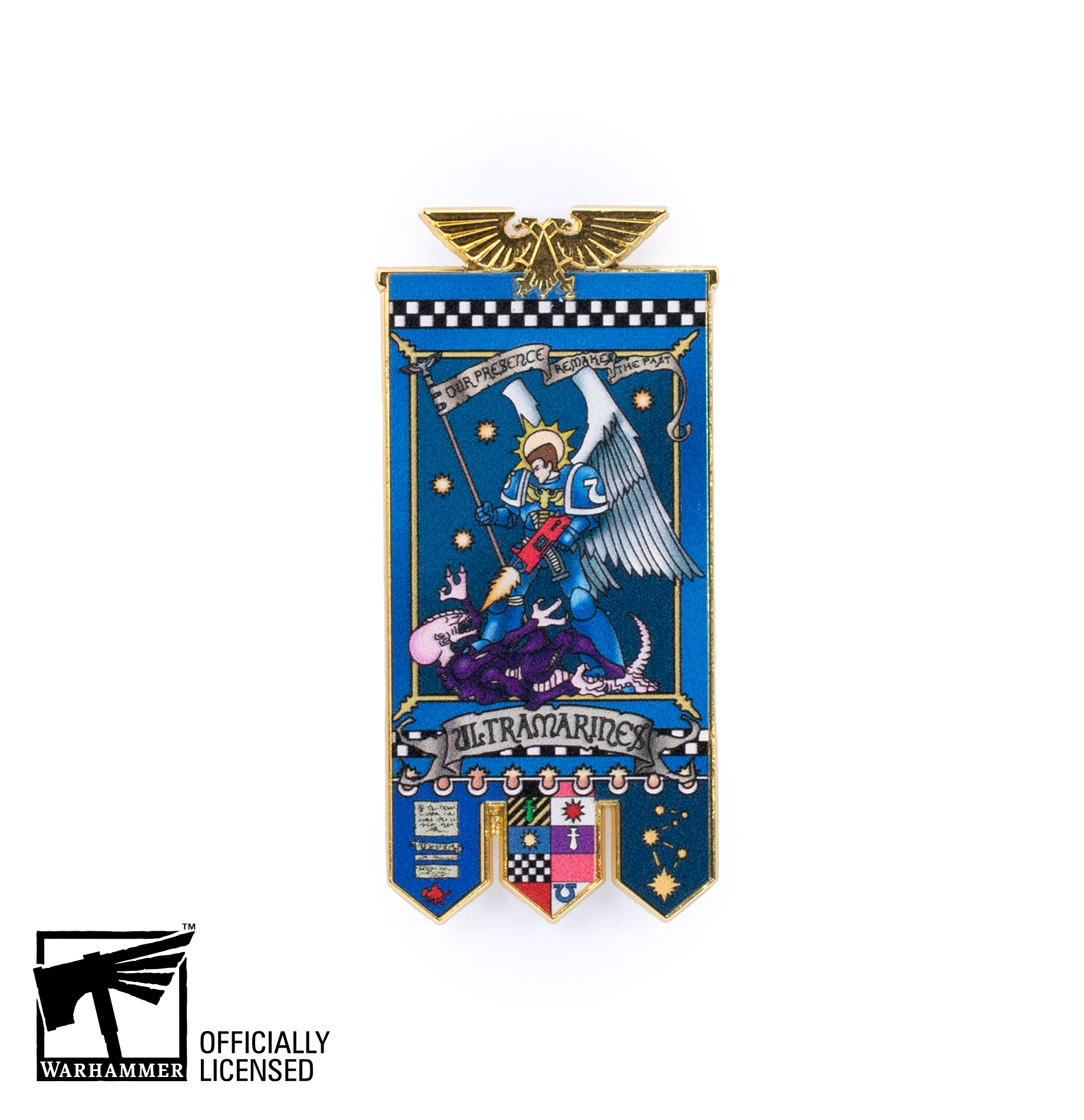 This gold-tone metal banner measures approximately 80mm tall by 30 to 35mm wide, depending on the design. The top is dominated by an aquila, just as you’d see adorning the finial on a banner pole. The front of the magnet features stunning full-colour artwork depicting an iconic banner of the Ultramarines – an angel-winged Space Marine